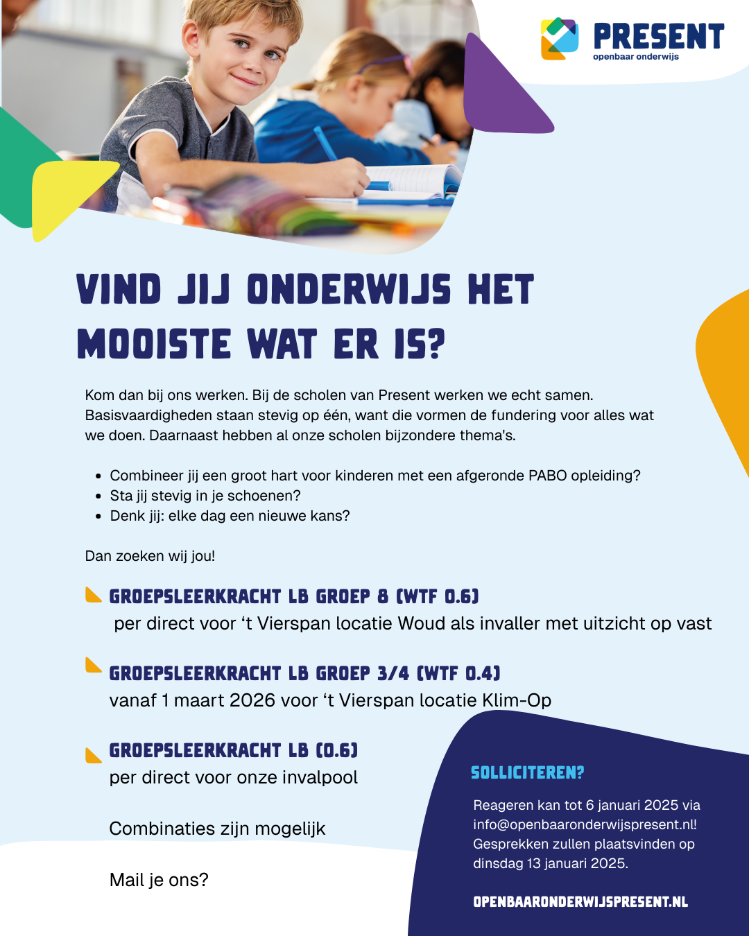Wij zoeken gedreven, enthousiaste mensen die een groot hart voor kinderen combineren met een afgeronde PABO opleiding.